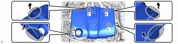 (a) Disengage the 4 clips in the order shown in the illustration and lift the V-bank cover sub-assembly upward to remove it.