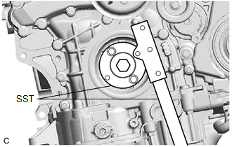 | (b) Using SST, hold the crankshaft pulley. SST: 09213-70011 09213-70020 SST: 09330-00021 |