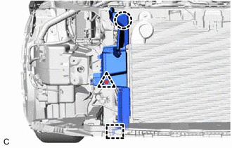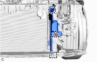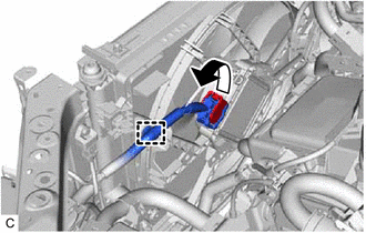 | (d) Rotate the lever while pushing the lock, and disconnect the cooling fan motor connector. NOTICE: After disconnecting the cooling fan motor connector, make sure that dirt, water or other foreign matter does not contact the connecting parts of the cooling fan motor connector. |