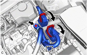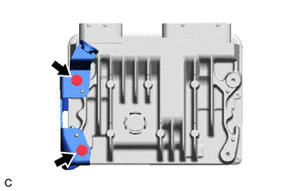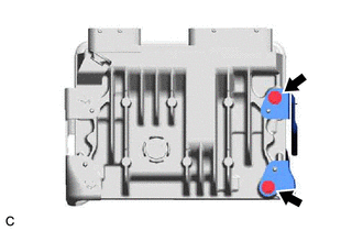 | (a) Rotate the 2 levers while pushing the locks, and disconnect the 2 ECM connectors. NOTICE: After disconnecting the ECM connectors, make sure that dirt, water or other foreign matter does not contact the connecting parts of the ECM connectors. |