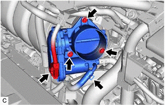 (c) Using an 8 mm socket wrench, remove the 3 bolts and separate the throttle body with motor assembly from the intake manifold.