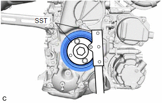 | (a) Using SST, hold the crankshaft pulley assembly. SST: 09213-54015 SST: 09330-00021 |