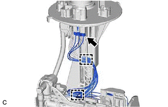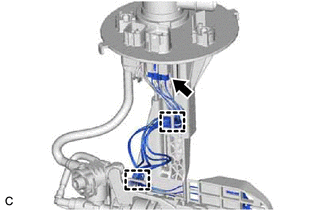| (3) Disengage the claw to remove the fuel sender gauge assembly from the fuel suction tube with pump and gauge assembly. NOTICE: Be careful not to bend the arm of the fuel sender gauge assembly. |