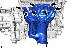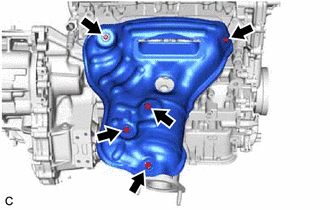 | (a) Using a 12 mm deep socket wrench, remove the 7 nuts and separate the exhaust manifold (TWC: Front Catalyst) from the cylinder head sub-assembly. |