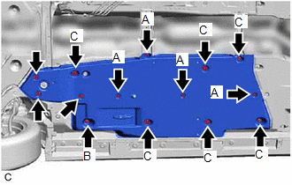 | (b) Type B: (1) Remove the 3 bolts and 4 clips (A). (2) Disengage the grommet (B) and 6 clips (C) to remove the front floor cover LH. |