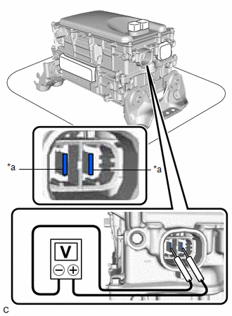| (b) Using a voltmeter, measure the voltage between the high voltage cable connector terminals. Standard voltage: 0V HINT:
