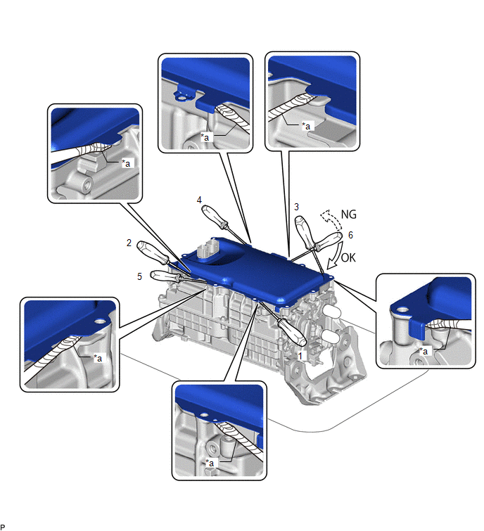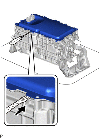 (c) Using a screwdriver with its tip wrapped with protective tape, remove the inverter upper cover from the inverter with converter assembly.