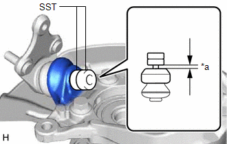 | (d) Install SST to the front lower ball joint assembly as shown in the illustration. SST: 09960-20010 09961-02050 NOTICE: Check that the clearance measurement between SST and the front axle assembly is 1 mm (0.0394 in.). | |