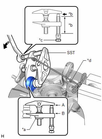 Install SST with the center nut so that (A) and (B) shown in the illustration are parallel. Otherwise, the front lower ball joint dust cover may be damaged.