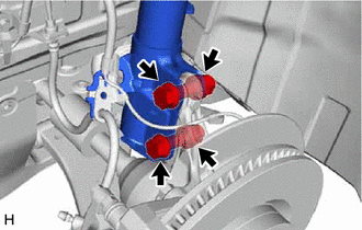 | (c) Remove the 2 bolts and separate the front speed sensor wire and front flexible hose from the front shock absorber assembly. NOTICE: Be sure to separate the front speed sensor wire and front flexible hose from the front shock absorber assembly completely. |