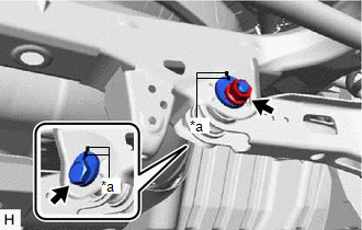 | (d) Remove the bolt and nut, and separate the rear No. 2 suspension arm assembly from the rear axle carrier sub-assembly. NOTICE: Because the nut has its own stopper, do not turn the nut. Loosen the bolt with the nut secured. |