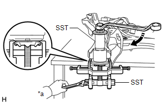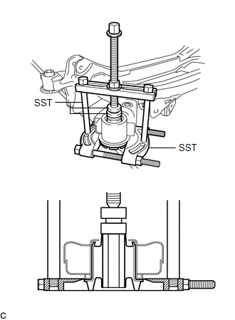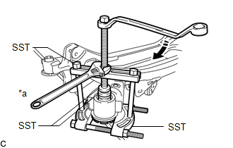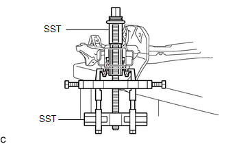 | (c) Install SST as shown in the illustration. SST: 09830-10010 09830-01010 09830-01040 09830-01050 SST: 09950-40011 09951-04010 09952-04010 09954-04010 09955-04061 09958-04011 NOTICE: Apply molybdenum grease to the threads and tip of the SST center bolt before use. |