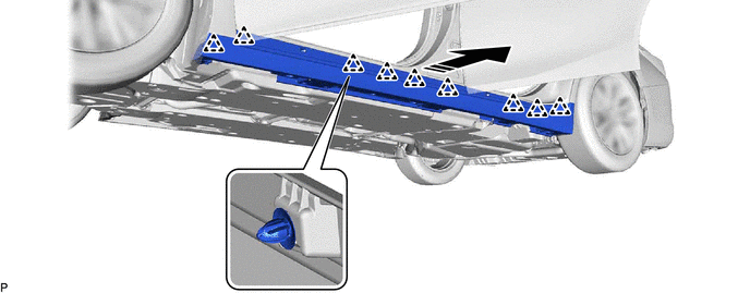 (e) Disengage the 9 clips to remove the body rocker panel moulding assembly as shown in the illustration.