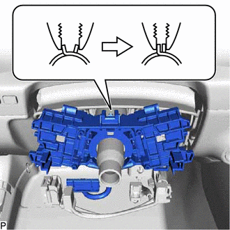 (b) While holding the clamp expanded, using a screwdriver with its tip wrapped with protective tape, disengage the claw and remove the steering wheel switch housing as shown in the illustration.