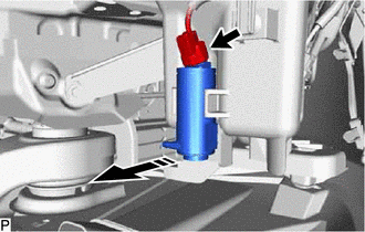 | (a) Disconnect the washer hose from the windshield washer motor and pump assembly, and drain the washer fluid. HINT: Use a container to collect the washer fluid. |