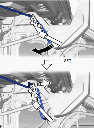 (a) Using SST, disconnect the luggage door hinge torsion bar RH from the luggage door hinge and the right side of the vehicle body as shown in the illustration.
