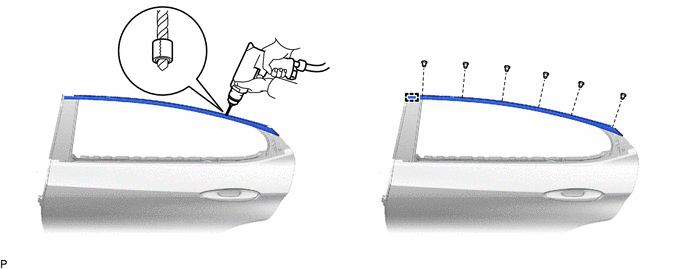 (c) Lightly press the drill bit against the rivets to drill off the rivet flanges, and remove the 6 rivets.