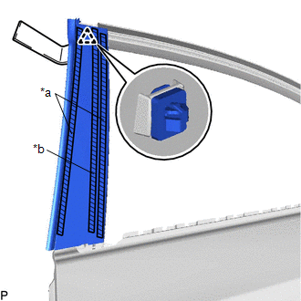 | (b) Using a moulding remover, disengage the clip and separate the double-sided tape and caulking sponge to remove the rear door front window frame moulding. |