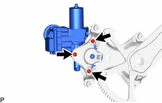 | (a) Using a T25 "TORX" socket wrench, remove the 3 screws and power window regulator motor assembly. |