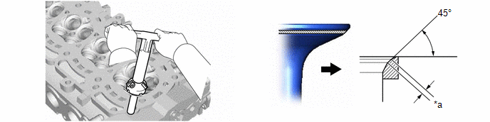 (a) Using 45° cutters, correct the exhaust valve seat so that the exhaust valve contacts the entire circumference of the exhaust valve seat. The contact should be in the center of the exhaust valve seat, and the exhaust valve seat width should be as specified around the entire circumference of the exhaust valve seat.
