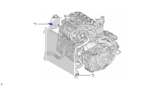 (c) Slowly pour engine coolant into the radiator reserve tank assembly until it reaches the F line. [*2] NOTICE: Do not substitute plain water for engine coolant. |