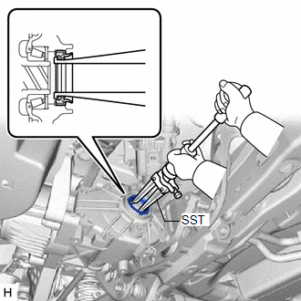 | (a) Using SST, tap out the rear drive shaft oil seal LH. SST: 09308-00010 NOTICE: Be careful not to damage the rear differential carrier sub-assembly. |