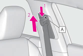 ■Adjustable shoulder anchor Always make sure the shoulder belt is positioned across the center of your shoulder. The belt should be kept away from your neck, but not falling off your shoulder. Failure to do so could reduce the amount of protection in an accident and cause death or serious injuries in the event of a sudden stop, sudden swerve or accident.