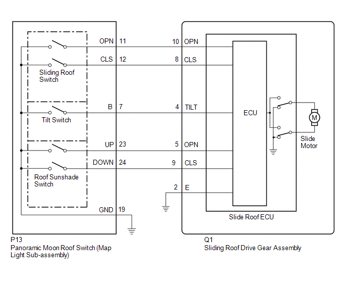 | 6. | CHECK HARNESS AND CONNECTOR (SLIDING ROOF ECU (SLIDING ROOF DRIVE GEAR ASSEMBLY) - PANORAMIC MOON ROOF SWITCH (MAP LIGHT SUB-ASSEMBLY) AND BODY GROUND) |