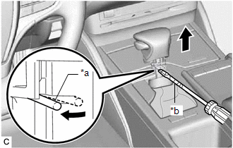 | (b) Using a screwdriver with its tip wrapped with protective tape, expand the left side of the clip and remove the shift lever knob sub-assembly from the transmission floor shift assembly as shown in the illustration. NOTICE: Be careful not to damage the shift lever knob sub-assembly. |