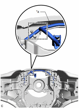 | (a) Engage the 4 guides to install the No. 1 switch wire to the steering wheel assembly. NOTICE: Make sure that the junction of the No. 1 switch wire is the right of the guide as shown in the illustration. |