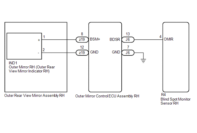 | 2. | CHECK HARNESS AND CONNECTOR (BLIND SPOT MONITOR SENSOR RH - OUTER MIRROR CONTROL ECU ASSEMBLY RH) |