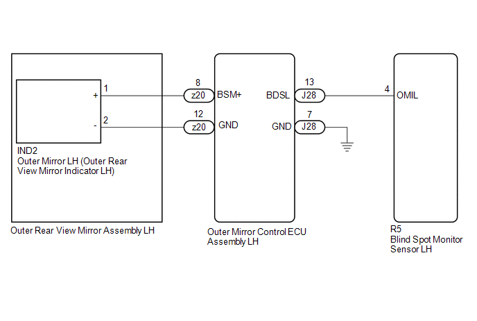 | 2. | CHECK HARNESS AND CONNECTOR (BLIND SPOT MONITOR SENSOR LH - OUTER MIRROR CONTROL ECU ASSEMBLY LH) |