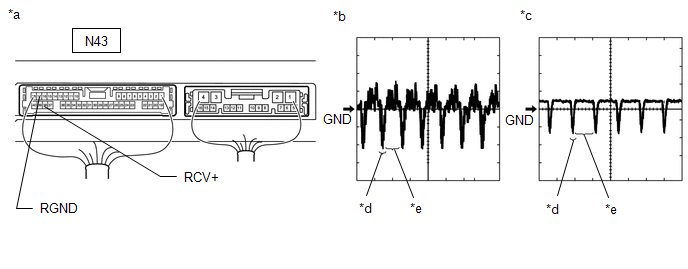 | *a | Component with harness connected (Parking Assist ECU) | *b | Waveform 1 (camera lens not covered, displaying an image) |