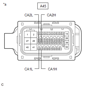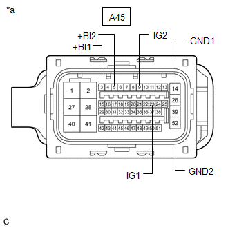 | A45-5 (+BI2) - Body ground | Power switch off | 11 to 14 V |