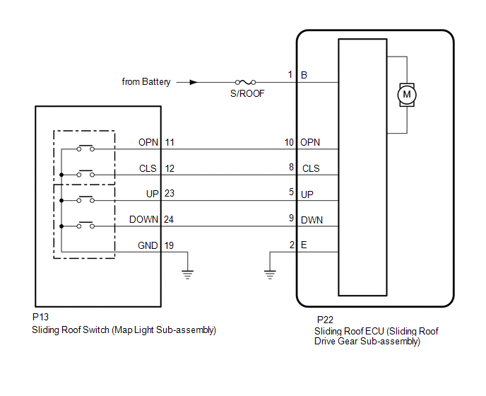 The sliding roof ECU (sliding roof drive gear sub-assembly) receives slide and tilt signals and operates its built-in motor when the sliding roof switch (map light sub-assembly) is operated.