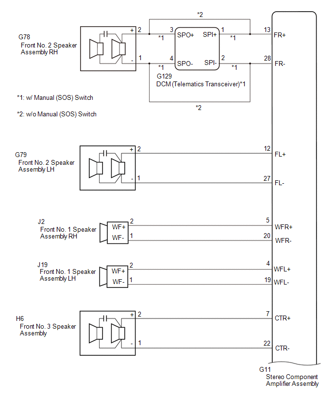 | 3. | CHECK HARNESS AND CONNECTOR (STEREO COMPONENT AMPLIFIER ASSEMBLY - DCM (TELEMATICS TRANSCEIVER) - FRONT NO. 2 SPEAKER ASSEMBLY) |