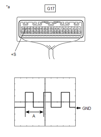 | (a) Check the output waveform. (1) Remove the combination meter assembly with the connector(s) still connected. (2) Connect an oscilloscope to terminal G17-19 (+S) and body ground. (3) Turn the engine switch on (IG). (4) Turn a wheel slowly. (5) Check the signal waveform according to the condition(s) in the table below.