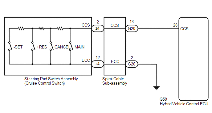 | 4. | CHECK HARNESS AND CONNECTOR (SPIRAL CABLE SUB-ASSEMBLY - HYBRID VEHICLE CONTROL ECU AND BODY GROUND) |