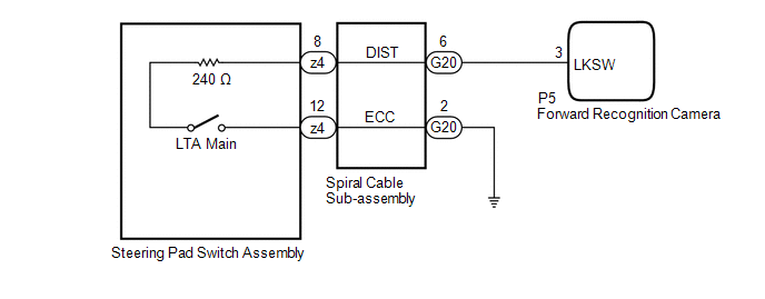 The forward recognition camera receives LTA main switch signals from the steering pad switch assembly.