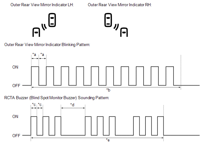 (1) When the RCTA function is turned on with the engine switch on (IG), the outer rear view mirror indicators on the outer rear view mirror assembly illuminate for 3 seconds and the RCTA buzzer (blind spot monitor buzzer) sounds for 1 second.