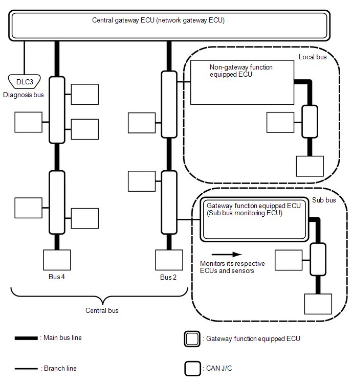 (1) A sub bus is a bus that has a gateway function equipped ECU in order to communicate with the central bus and other sub buses.