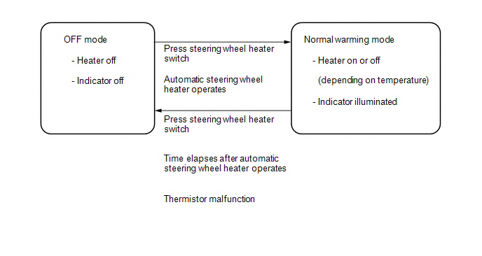 When the system is turned off using the steering wheel heater switch (refreshing seat switch) or steering wheel heater switch (multi-display assembly), the indicator turns off and the steering wheel heater control assembly stops supplying operating current to the steering wheel heater unit.