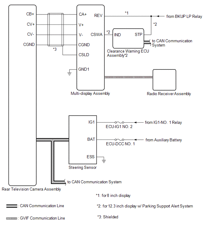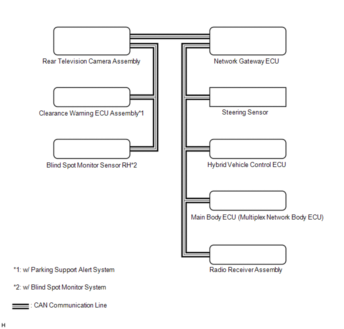 | Clearance Warning ECU Assembly*2 | Rear Television Camera Assembly | Sonar information signal | CAN |