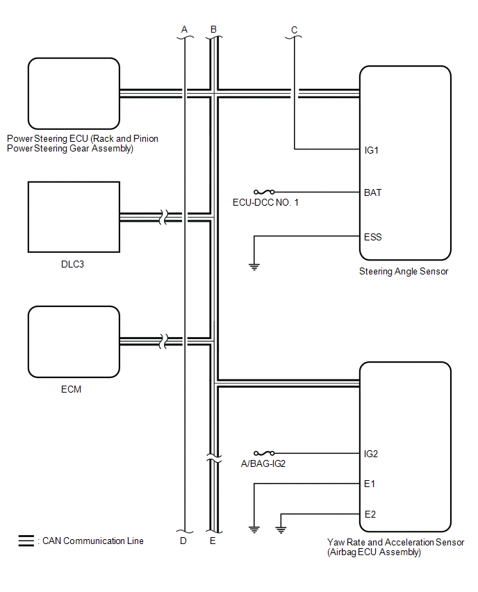 | Yaw rate and acceleration sensor (airbag ECU assembly) | Skid control ECU (brake actuator assembly) | Yaw rate and acceleration signal | CAN communication line |