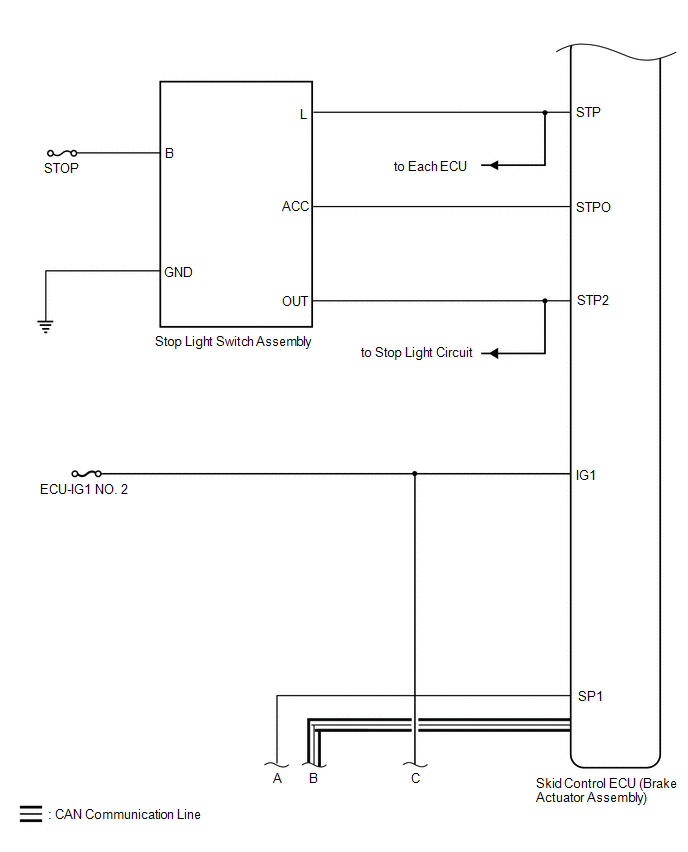 | Skid control ECU (brake actuator assembly) | Steering angle sensor | Steering angle sensor request signal | CAN communication line |