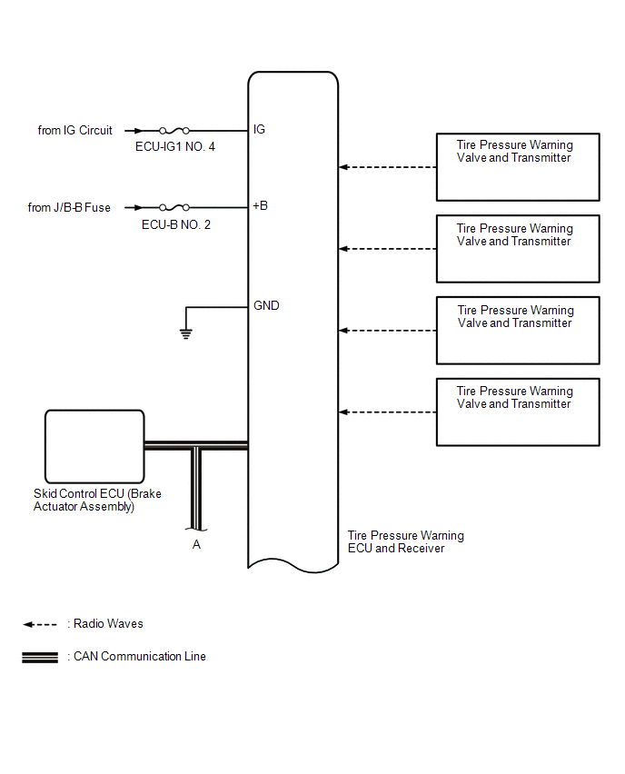 | Skid Control ECU (Brake Actuator Assembly) | Tire Pressure Warning ECU and Receiver | Speed sensor signal | CAN communication line |