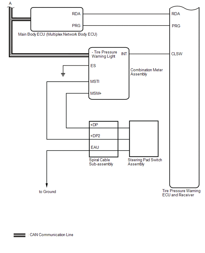 | Main Body ECU (Multiplex Network Body ECU) | Combination Meter Assembly | Tire pressure warning light signal | CAN communication line |