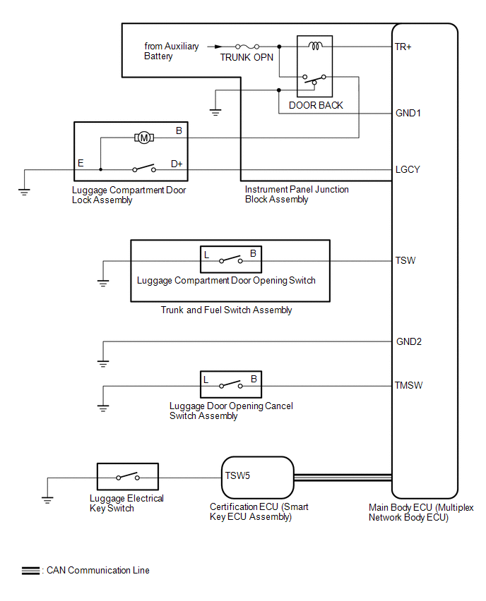 | Certification ECU (Smart Key ECU Assembly) | Main Body ECU (Multiplex Network Body ECU) | Luggage compartment door lock assembly open operation signal | CAN |