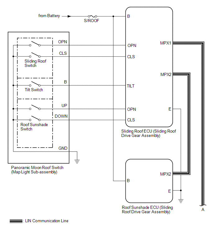 | Sliding Roof ECU (Sliding Roof Drive Gear Assembly) | Main Body ECU (Multiplex Network Body ECU) | Sliding roof glass position signal | LIN |