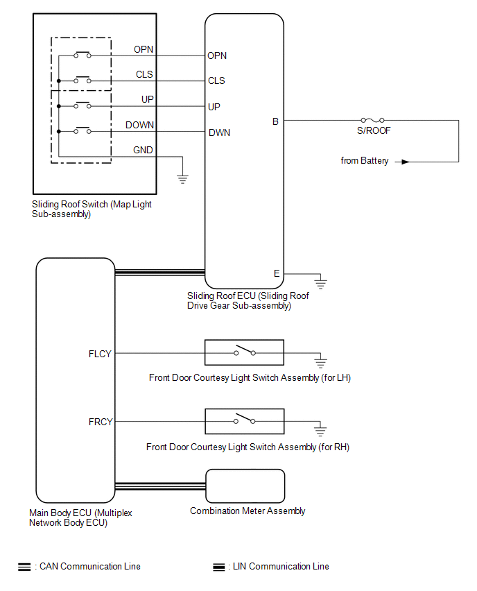 | Sliding Roof ECU (Sliding Roof Drive Gear Sub-assembly) | Main Body ECU (Multiplex Network Body ECU) | Sliding roof position signal | LIN |